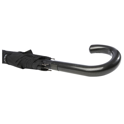 Dáždnik s automatickým otváraním, kupolou z polyesterového hodvábu a robustnou čiernou kovovou tyčou. Vysoko kvalitný celolaminátový rám zaisťuje maximálnu flexibilitu vo veterných podmienkach. Zahnutá rukoväť s povrchovou úpravou vzhľadu uhlíkovej ocele a čiernej poniklovanej špičky. Tkaná etiketa na kupoli s nápisom Luxe a zapínací opasok. Veľká dekoratívna plocha na každom z panelov.