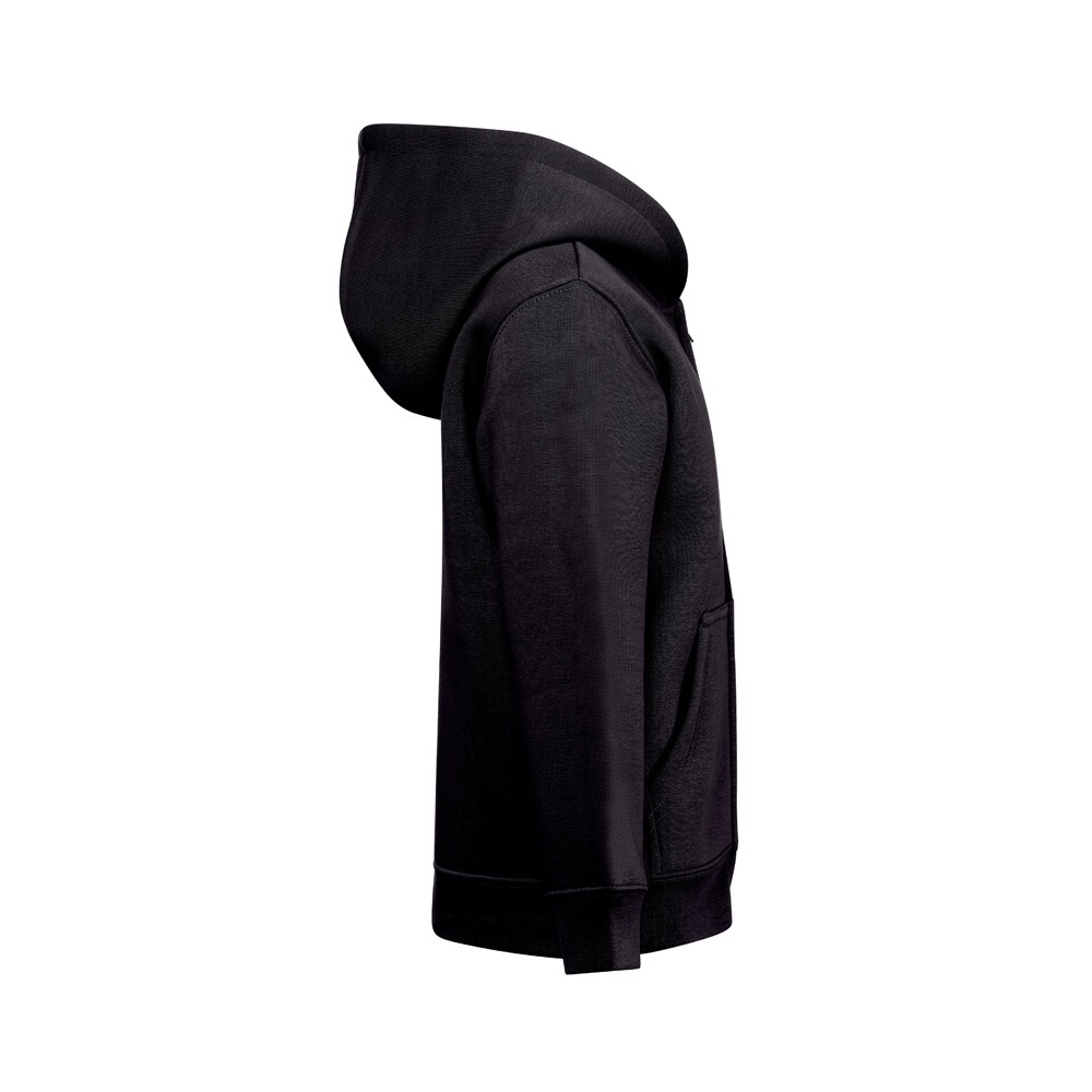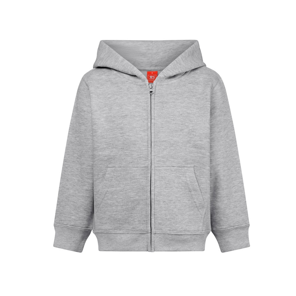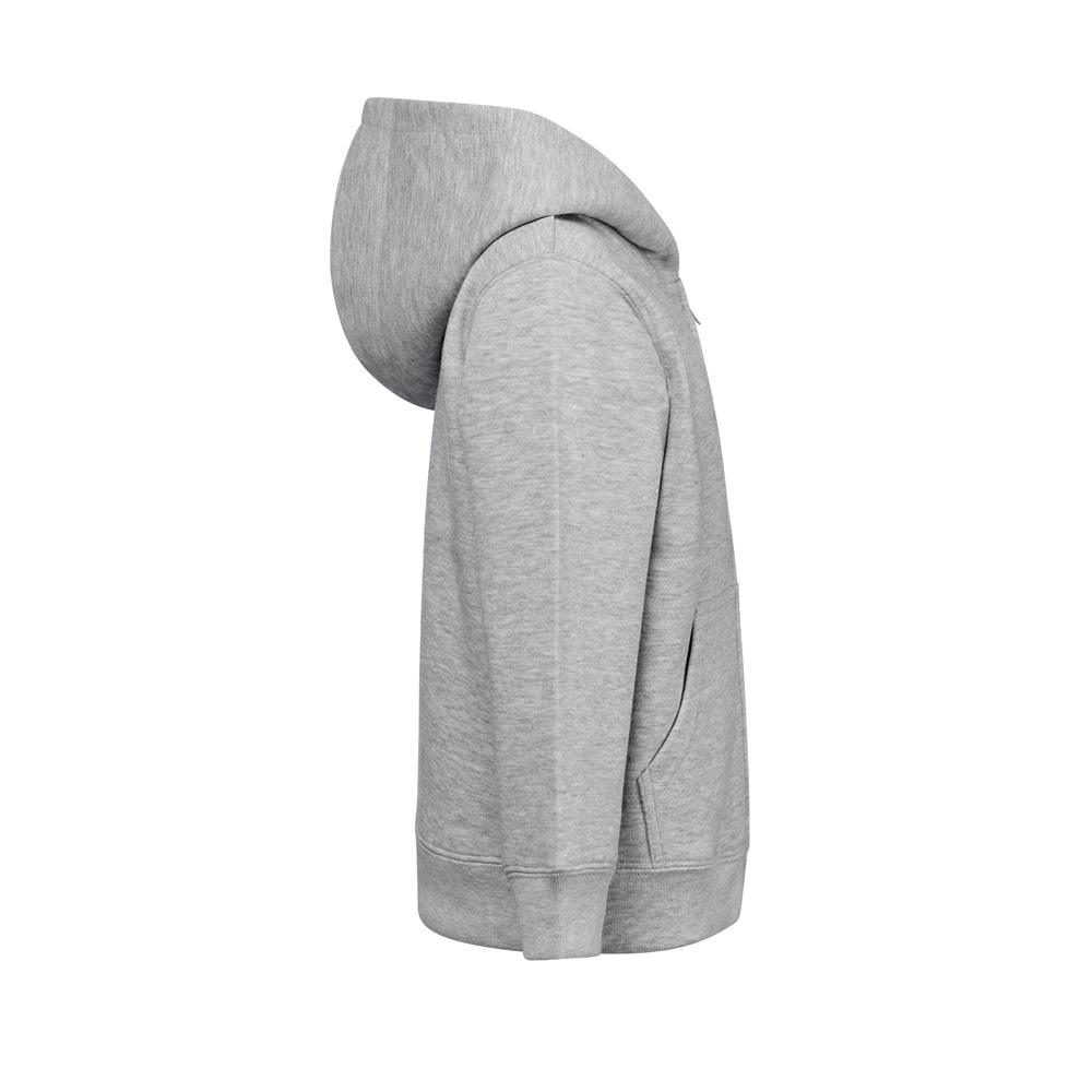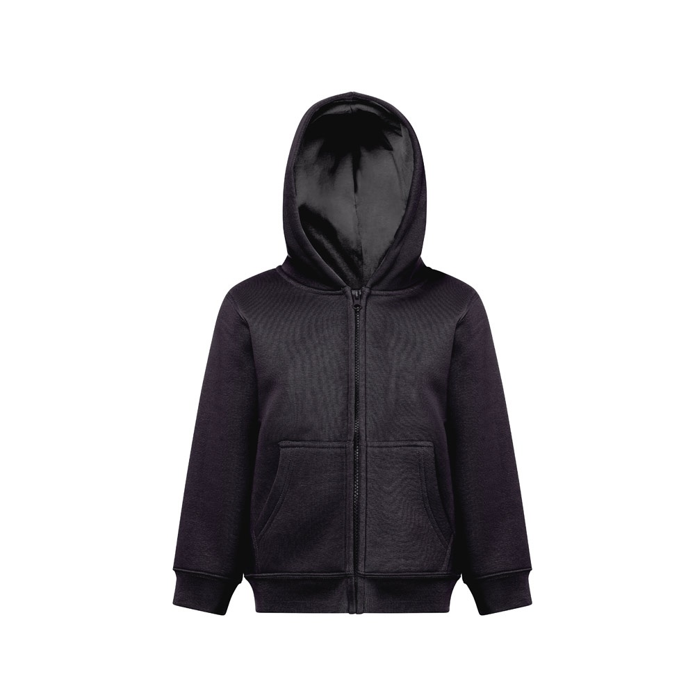 Enzýmom ošetrená detská bunda z amerického terry froté (50 % bavlna s udržateľnými poľnohospodárskymi postupmi) a 50 % recyklovaný polyester (320 g/m²). Kapucňa bez šnúrok a podšitá džersejom v rovnakej farbe ako bunda, spĺňajúca bezpečnostné normy Európskej únie. Obsahuje manžety a spodnú časť s rebrovaním 1x1, 2 bočné vrecká, zips s jazdcom, ťaháčikom a kartónovým vnútrom. Veľkosti: 4, 6, 8, 10, 12