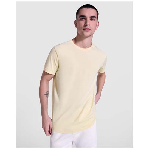 Pánske tričko s krátkym rukávom. Vypraný vzhľad. Rebrovaný okrúhly výstrih 1 × 1. Krycí steh v tóne látky s uhladenou povrchovou úpravou.