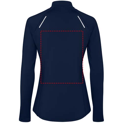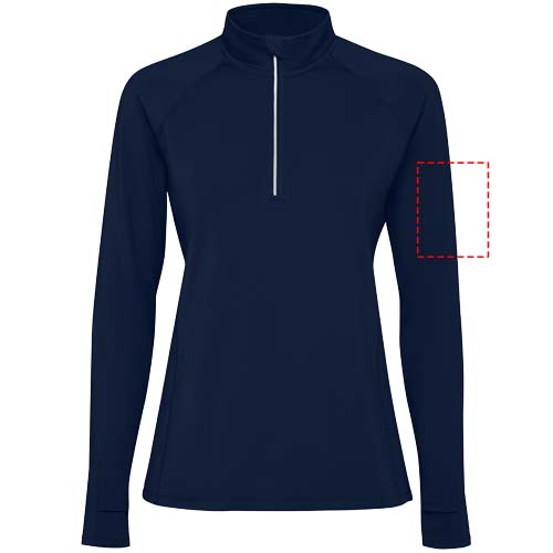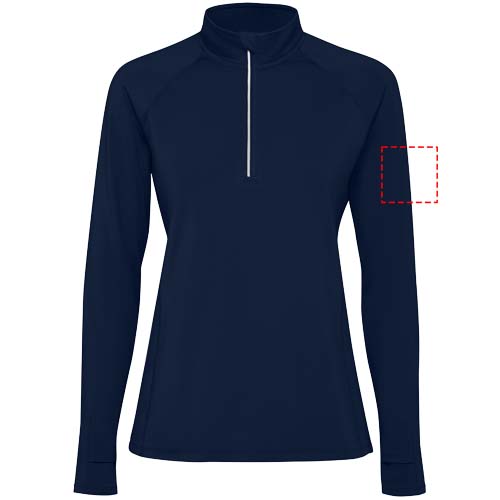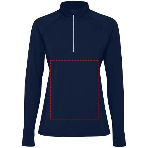 Dámska raglánová mikina s dlhým rukávom. Slim-fit. Golier s obráteným dizajnom na polovičný zips s reflexnými detailmi. Zosilnené kryty švov. Manžety s otvormi na palce. Reflexné detaily na zadnej strane. Zadný lem je o niečo dlhší ako predný. Teplá kartáčovaná vnútorná tkanina.