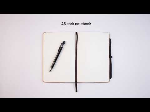 Korkový zápisník formátu A5. Obsahuje 160 hladkých strán (70 g/m²) z materiálu s certifikátom FSC™ a ďalších kontrolovaných materiálov, držiak na pero (nie je súčasťou balenia), oddeľovací prúžok a elastickú pásku na uzavretie zápisníka. Keďže výrobok je vyrobený z prírodných materiálov, farba a výsledok tlače sa môžu medzi výrobkami líšiť. 140 x 210 mm