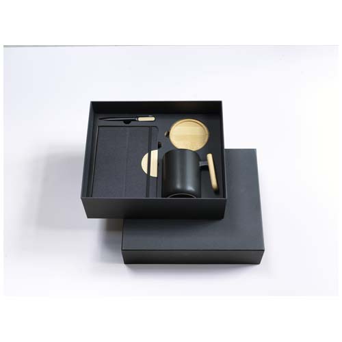 Darčeková sada Laura obsahuje zápisník A5 z materiálu RPET s tvrdou väzbou, guličkové pero, keramický hrnček a podtácok. Zápisník má čierny elastický uzáver, stuhu ako záložku a 80 linkovaných listov papiera v krémovej farbe s gramážou 80 g/m². Dosky zápisníka spolu s bambusovým polkruhom fungujú ako stojan na telefón. Guľôčkové pero je vyrobené z recyklovaného hliníka s certifikáciou RCS s čiernym nástrekom a bambusovými doplnkami na oboch stranách hornej časti tela pera. Atrament do pera: Čierna. Dĺžka písania: 400 metrov. Keramický hrnček s objemom 480 ml je dodávaný s bambusovým podtáckom. Iba ručné umývanie. Veľkosť hrnčeka: 11 × 12,7 cm. Priemer podtácku: 9,5 cm. Veľkosť darčekovej krabičky: 32 × 27 × 10,3 cm.