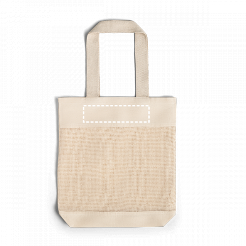 Taška zo 100 % bavlny (180 g/m²) so sieťovinou zo 100% bavlny na prednej strane. Bavlny opruh s dĺžkou 65 cm. Ideálna taška na nákup. 390 x 430 x 80 mm