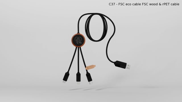 Nabíjací kábel 5v1 z recyklovaného PET so svietiacim logom a okrúhlym bambusovým puzdrom. Svietiace logo je viditeľné na oboch stranách. Má 3 konektory (typ C, micro USB, iPhone) a duálny USB konektor na univerzálne použitie. Dodáva sa v sáčku z TPU s kartičkou z kraftového papiera. Dĺžka kábla: 1 meter. Záruka 3 roky.