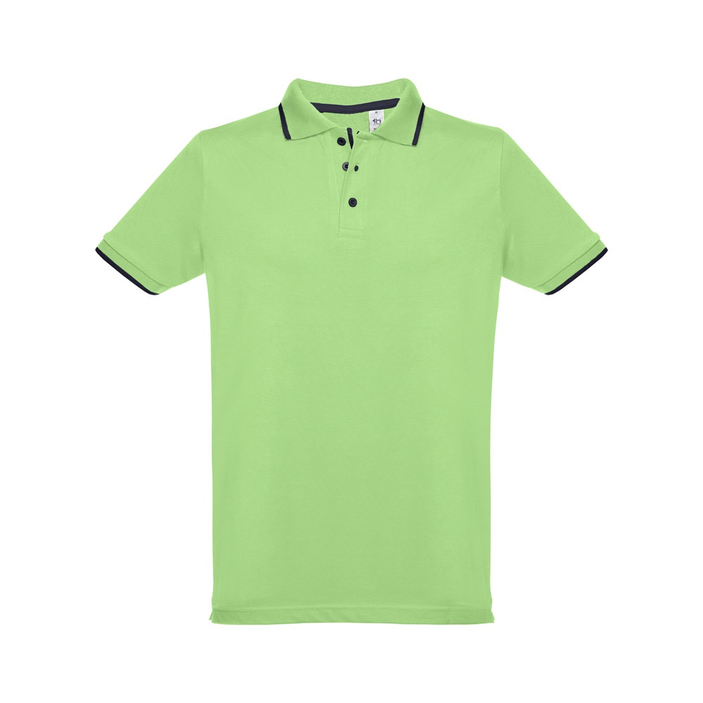 Pánska priliehavá polokošeľa zo 100 % bavlneného pique (195 g/m²) priliehavého strihu s bočnými rázporkami. Farba 83: 85% bavlna a 15% viskóza. Krátky rukáv. Rebrovaný golier a rukávy. Dvojfarebný kontrast na golieri, lézie a rukávoch. Vystužená léga. Náhradný gombík vo vnútornom šve. Veľkosti: S, M, L, XL, XXL