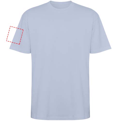 Tričko s krátkym rukávom v nadmernej veľkosti. Okrúhly golier zdobený 2×1 rebrovým úpletom so zladenými krytmi švov. Bočné švy. Široké dvojité prešívanie na rukávoch a leme. Odnímateľný štítok.