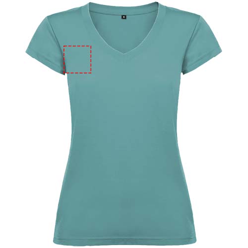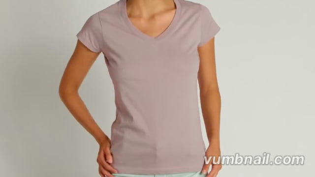 Dámske tričko s krátkym rukávom a výstrihom do V s úpravou 1x1 rebrovania. Úzky strih s bočnými švami. Odnímateľný štítok. Modelka meria 174 cm a má na sebe veľkosť S.