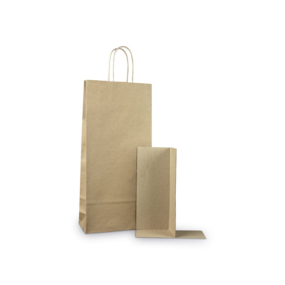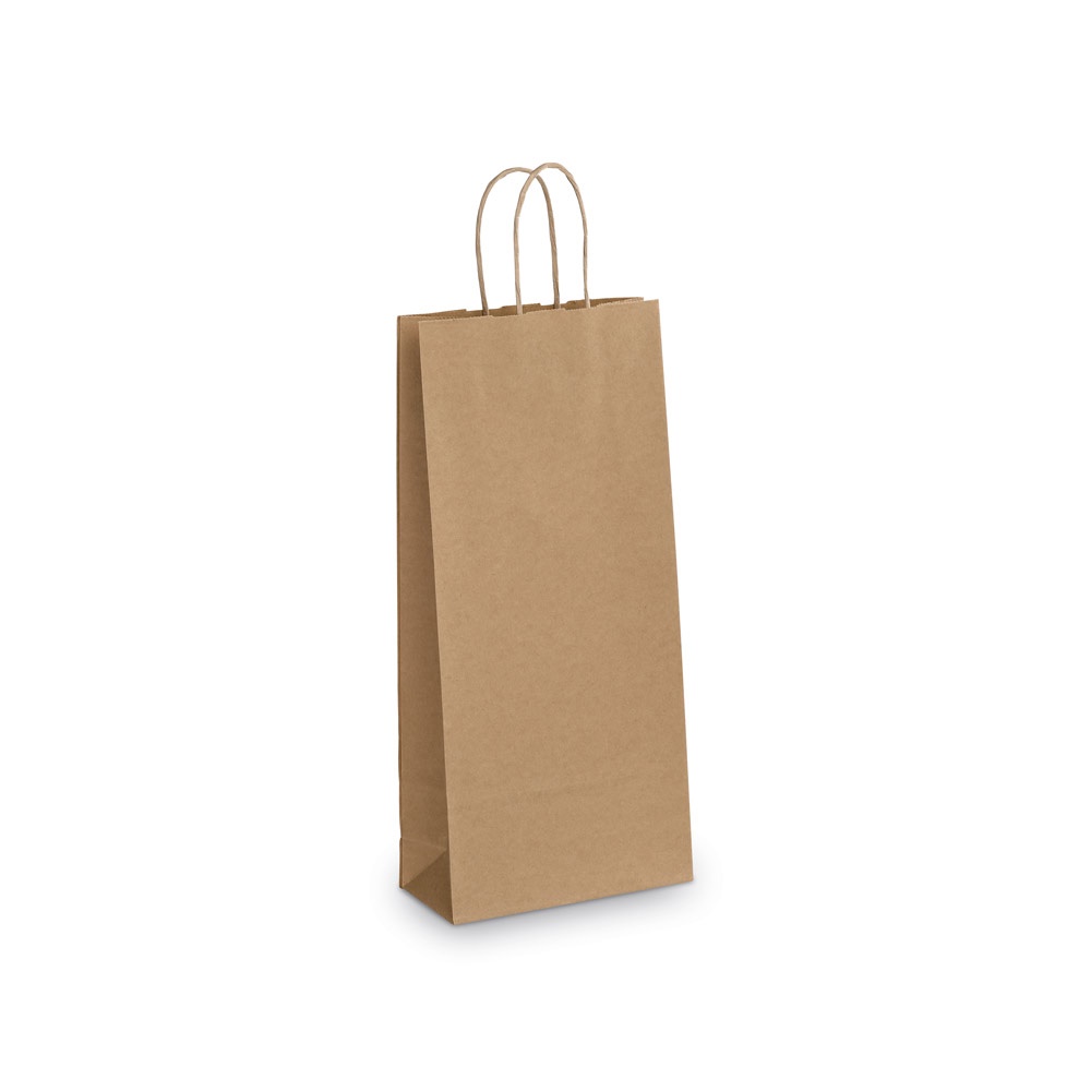 Taška na dve fľaše vína z kraftového papiera, krútené papierové rukoväte. Obsahuje kartón na prekladanie fliaš vo vnútri. 180 × 390 × 80 mm