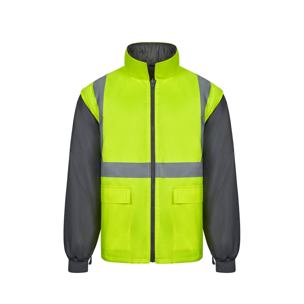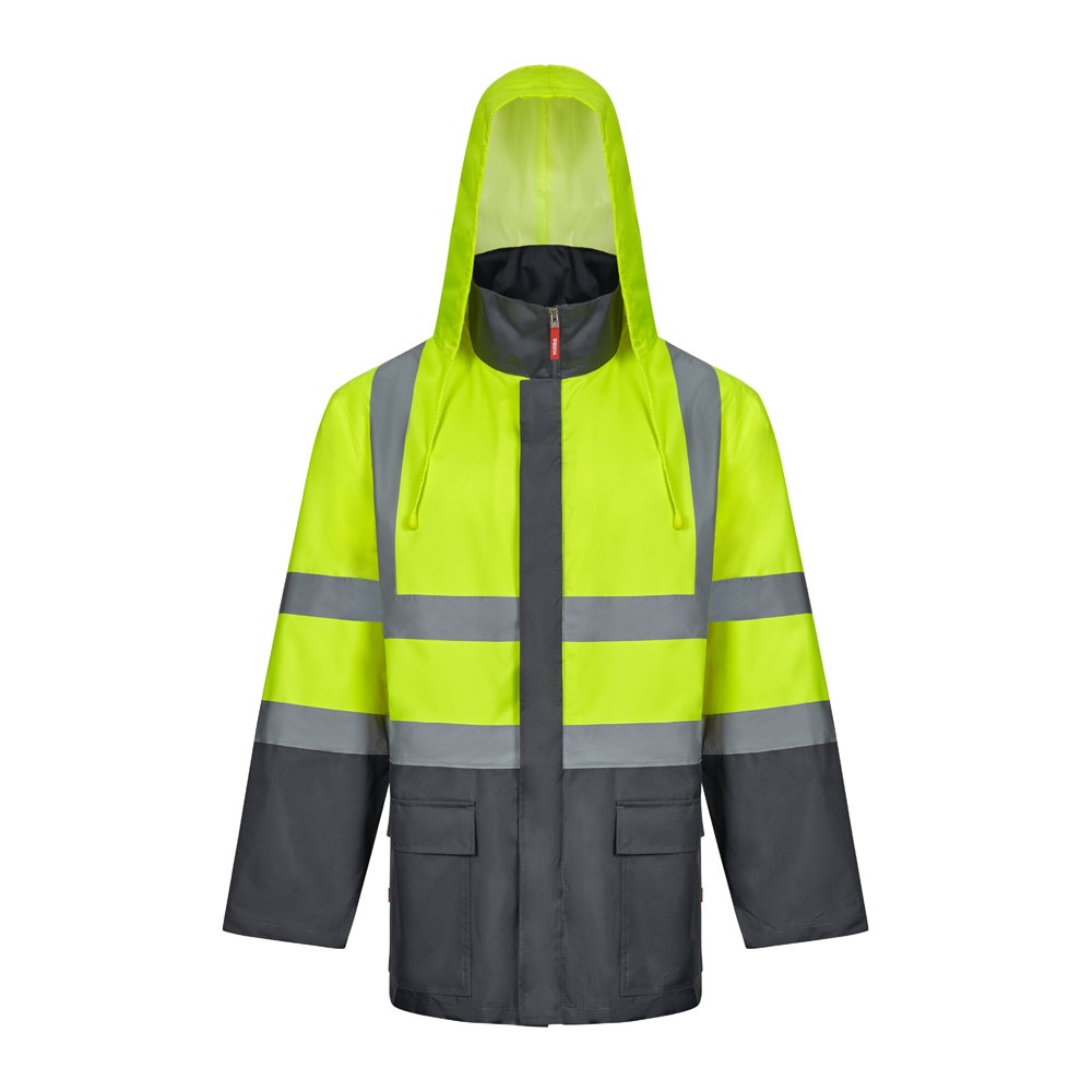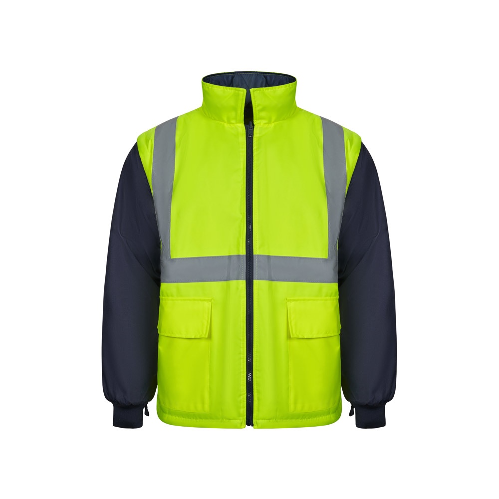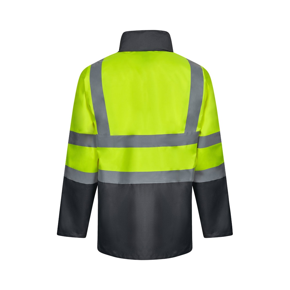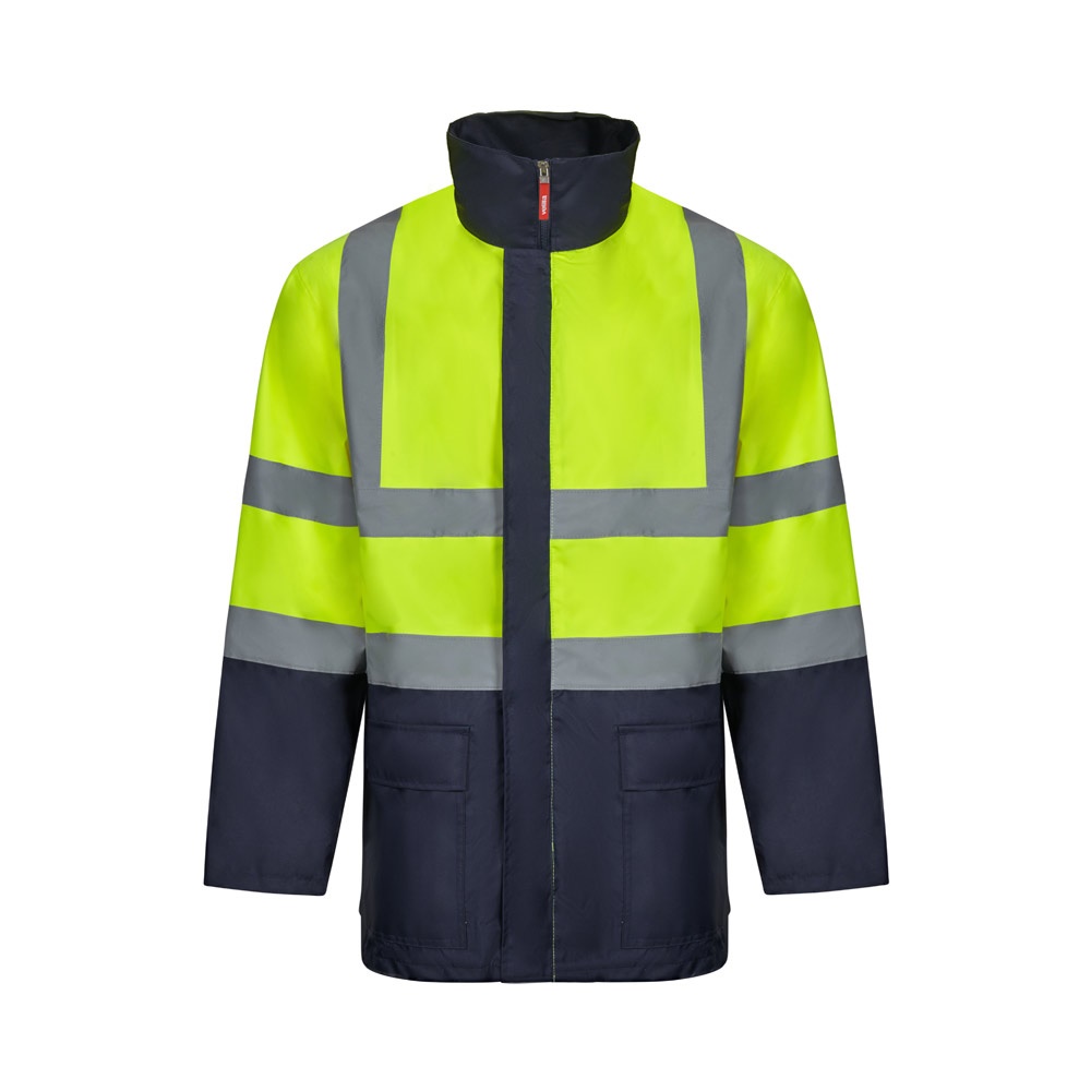 Dvojfarebná parka 4 v 1 (180 g/m²), z polyesteru (100 %) s PU záterom. Štyri kusy v jednom: parka, pláštenka, bunda a vesta.Parka/pršiplášť: so skrytým centrálnym zipsom s légou, ktorý sa zapína na suchý zips, reflexné pruhy na trupe, ramenách a rukávoch a skrytá kapucňa, s dvoma spodnými vreckami.Bunda/vesta: s centrálnym zipsom, reflexnými pruhmi na trupe a ramenách, rebrovanými manžetami a odnímateľnými rukávmi. S tromi vreckami (2 spodné vrecká a 1 vnútorné vrecko). Výrobok v súlade s EU Reg. 2016/425, certifikovaný EN20471 a trieda č. 2. Veľkosť: S, M, L, XL, 2XL, 3XL