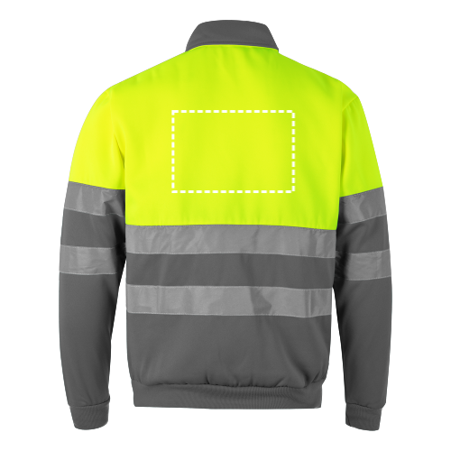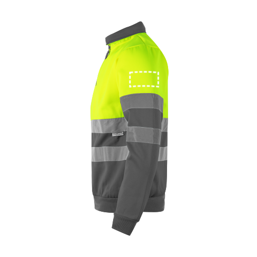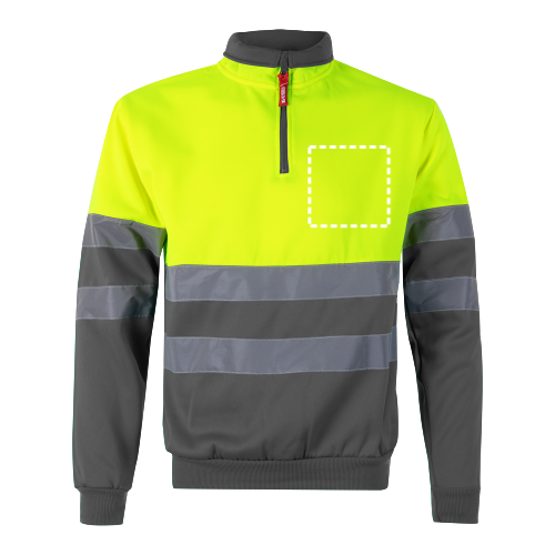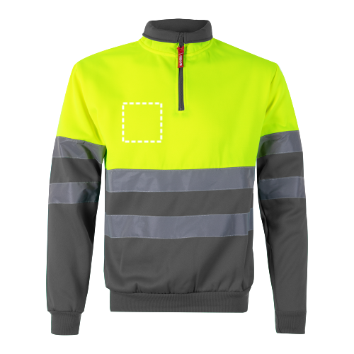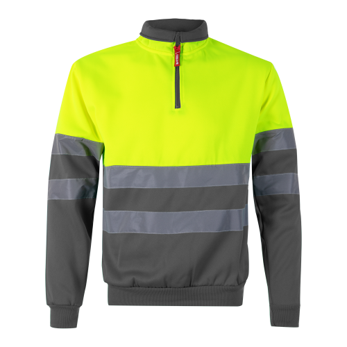 Dvojfarebná mikina (300 g/m²) z polyesterového fleecu (100 %). S vysokým golierom a polovičným zipsom. Rebrované manžety a spodný lem. Reflexné pruhy na trupe a rukávoch. Výrobok v súlade s EU Reg. 2016/425, certifikovaný EN20471 a trieda č. 1. Veľkosť: 4XL, 5XL