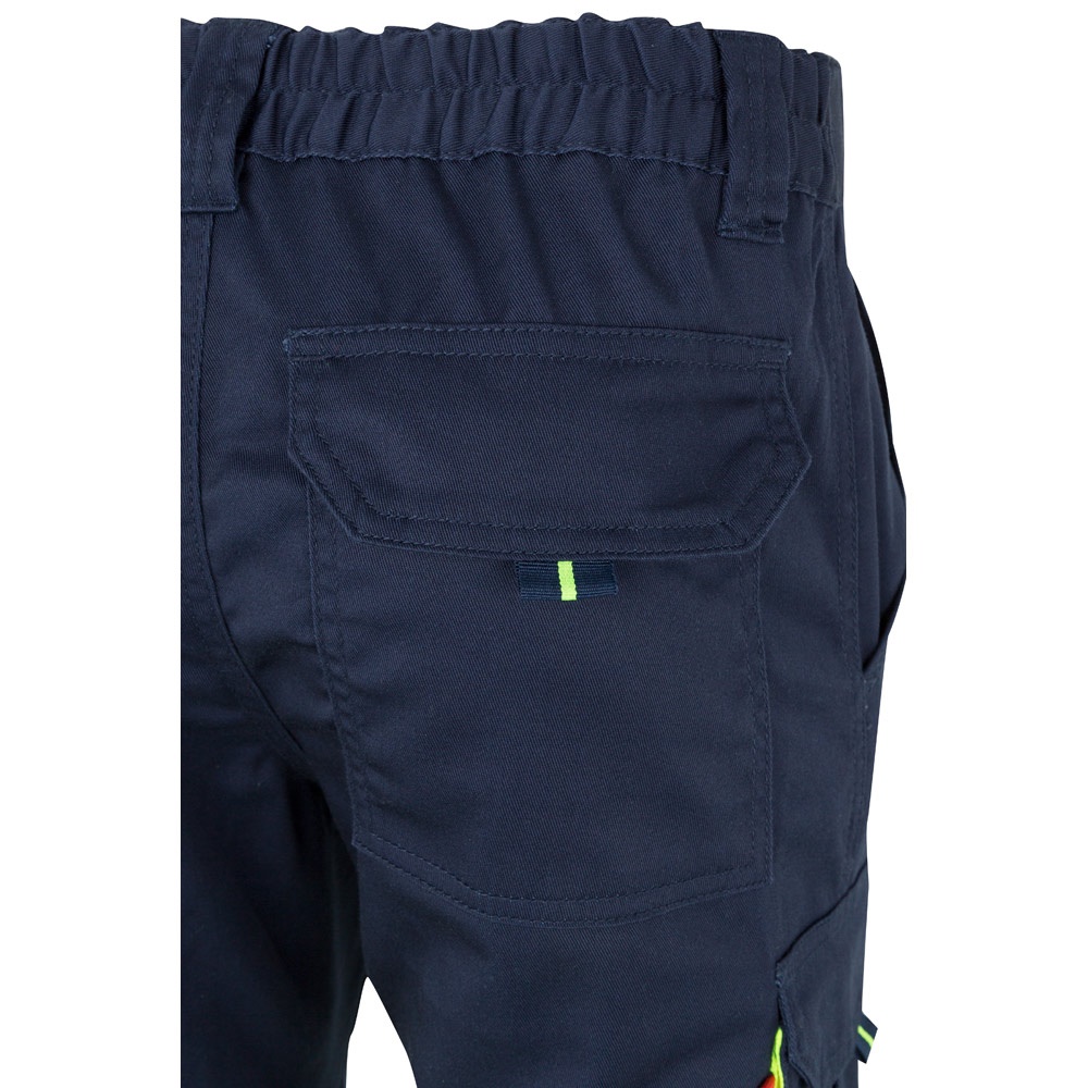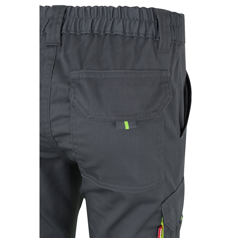 Dvojfarebné strečové nohavice s viacerými vreckami (240 g/m²), z bavlny (46%), EME (38%) a polyesteru (16%). S elastickým pásom a reflexnými pruhmi na spodnej časti nohavíc. Kontrastná farba na mechoch, sťahovačoch a látke medzi reflexnými pruhmi Šesť vreciek (2 francúzske, 2 bočné a 2 zadné). Výrobok v súlade s EU Reg. 2016/425, certifikovaný EN20471 a trieda č. 1. Veľkosť: S, M, L, XL, 2XL, 3XL